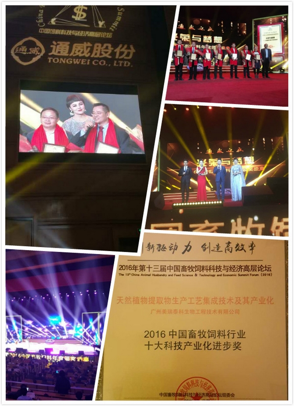 十年櫛風(fēng)沐雨,十年春華秋實(shí)。在碩果累累的今朝,美瑞泰科公司帶來了豐收的氣息,迎接她十年的華誕。2016年12月,經(jīng)過17位來自國家農(nóng)業(yè)部畜牧飼料行業(yè)主管司局和協(xié)會領(lǐng)導(dǎo)、行業(yè)經(jīng)濟(jì)學(xué)家、科學(xué)家和企業(yè)代表組成的豪華陣容專家評審團(tuán),對申報的數(shù)十項(xiàng)產(chǎn)業(yè)化技術(shù)成果進(jìn)行了綜合評定,美瑞泰科公司參選的“天然植物提取物生產(chǎn)工藝集成技術(shù)及其產(chǎn)業(yè)化”項(xiàng)目在眾多優(yōu)秀項(xiàng)目中脫穎而出,獲得專家的高度評價及認(rèn)可,喜獲“2016中國畜牧飼料行業(yè)十大科技產(chǎn)業(yè)化進(jìn)步獎”。在北京會議中心召開的“2016(第十三屆)中國畜牧飼料與經(jīng)濟(jì)高層論壇”期間,大會給予公司隆重的表彰,并頒發(fā)獲獎證書。此次表彰活動由中央電視臺著名編導(dǎo)策劃,按現(xiàn)場直播規(guī)格舉行的盛大頒獎典禮,堪稱中國畜牧飼料行業(yè)的“奧斯卡”,讓美瑞泰科公司與行業(yè)翹楚、企業(yè)精英以及全國億萬人民共同見證分享了這一激動人心的時刻。