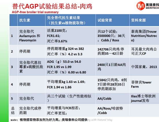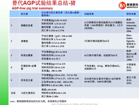 美瑞泰科金立志博士分享了“豬無抗日糧的營養(yǎng)與飼料配制策略”。金博士指出歐洲禁用抗生素已經(jīng)10年,豬的生產(chǎn)性能(PSY,F(xiàn)CR)繼續(xù)顯著改善,說明了飼料禁抗是可行的。但是需要做好各項(xiàng)綜合的措施,一是管理與預(yù)防,比如通過改善環(huán)境,通風(fēng),飲水等;疫苗;減少病原微生物源頭(如病菌和寄生蟲等);二是日糧原料調(diào)整,如易消化、低粗蛋白日糧,使用易消化蛋白(血漿蛋白粉)/脂肪,減少可發(fā)酵可溶性CHO(使用淀粉), 飼料新鮮或飼料原料無霉變;三是使用抗生素替代添加劑,如酸化劑、氧化鋅/硫酸銅、植物提取物、益生素/促生素/寡糖、酶制劑等。歐洲在禁抗后酸化劑的使用比較普遍。酶制劑在家禽的粘性谷物日糧中也比較普遍使用。但酶制劑使用的問題是要分清使用目的和目標(biāo)底物和足夠的添加量等問題。益生菌主要通過與細(xì)菌競爭粘著位點(diǎn)而抑制有害菌的粘著與定居從而改善動(dòng)物健康,對(duì)益生菌的耐高溫和耐胃酸和膽鹽等特性需要更多研究。植物提取物在發(fā)達(dá)國家如歐盟等用量比較廣泛,在發(fā)展中國家接受度正在提高,對(duì)于腸道菌群明確抑制病原性細(xì)菌生長,可以選擇性殺滅腸道病原菌;并且適口性好,提高采食量,提高消化吸收。對(duì)于植物提取物產(chǎn)品(好力高),來自于歐美等大學(xué)和研究所以及大型企業(yè)研發(fā)中心(10幾篇博士碩士論文,30多篇SCI文章)的試驗(yàn)結(jié)果表明:止痢草提取物(好力高)可以直接抗菌殺菌,保障豬腸道健康/防止仔豬下?。欢谴龠M(jìn)仔豬和母豬食欲,增加采食量;三是強(qiáng)力抗氧化,提升豬肉品質(zhì);四是提升母豬仔豬自身免疫功能;五是無殘留,無停藥期,綠色安全。金博士也總結(jié)了豬雞飼料中使用好力高部分替代(硫粘)和完全取代的試驗(yàn)結(jié)果總結(jié)如下。