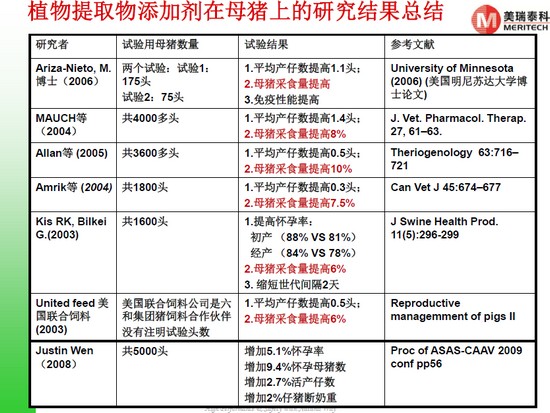 美瑞泰科技術(shù)與研發(fā)總監(jiān)袁保京博士講解了“植物提取物在豬營養(yǎng)與飼料中的研究進(jìn)展與實(shí)際應(yīng)用”。袁博士指出,養(yǎng)豬生產(chǎn)面臨消化道、呼吸道和生殖道三個(gè)“管道系統(tǒng)”健康威脅,目前解決威脅的應(yīng)用措施主要有營養(yǎng)手段、抗病手段和科學(xué)管理及動(dòng)物福利。其中抗病手段包括藥物添加劑、植物提取物等??股貙?duì)畜牧生產(chǎn)貢獻(xiàn)功不可沒,但隨著抗生素的濫用,耐藥株越來越多,減抗、替抗、甚至無抗成為行業(yè)發(fā)展的方向。植物提取物(好力高)在抗菌殺菌方面的研究已經(jīng)有30多年的歷史,對(duì)抗炎癥和抗氧化的研究在近年來越多。近10年來的研究結(jié)果表明,植物提取物(好力高)具有氧自由基清除作用,對(duì)動(dòng)物內(nèi)源性抗氧化系統(tǒng)的作用。袁博士也指出,止痢草提取物可以顯著提高母豬泌乳期的采食量,減少泌乳期失重??梢蕴岣?1日齡仔豬日增重3%,增加仔豬斷奶體重,窩重約增加10%??梢钥s短初產(chǎn)母豬斷奶發(fā)情間隔約1天。植物提取物添加劑在母豬上的研究結(jié)果總結(jié)如下。