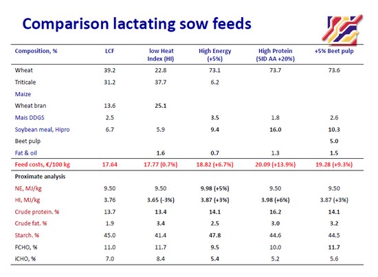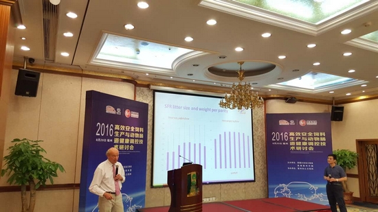 來自荷蘭SFR飼料研究所專家Jannes Doppenberg博士講解“提高母豬采食量,泌乳量和繁殖性能的營養(yǎng)與飼料措施”。母豬泌乳期對(duì)飼料采食要求嚴(yán)格,同時(shí)對(duì)環(huán)境溫度要求也敏感,泌乳母豬適宜溫度區(qū)間為12-22℃,超過該溫度區(qū)間,體表血液量增加,而乳腺血液量相應(yīng)減少,當(dāng)環(huán)境溫度從24℃上升到26℃后,泌乳量下降16%,同時(shí)乳脂率上升。新生仔豬從出生到21天,體重增加的最大潛能為466g/d,泌乳量隨之每天需要增加43%。新生仔豬大小和活力決定了乳腺的發(fā)育程度,進(jìn)而決定泌乳量。每增加一頭仔豬,泌乳量增加0.6kg,而每頭仔豬獲得的母乳將隨之減少。對(duì)于泌乳期母豬飼料,飼料中高粗蛋白含量將降低采食量,尤其在熱應(yīng)激狀態(tài)下更是如此,因此考慮以可消化氨基酸為基礎(chǔ)的理想蛋白質(zhì)模型來做配方,使用合成氨基酸和高質(zhì)量蛋白飼料原料;淀粉和糖是生糖營養(yǎng)素,可以提高產(chǎn)奶量并降低體重?fù)p失,因此只有當(dāng)母豬處于能量負(fù)平衡狀態(tài)下再額外添加脂肪。發(fā)酵纖維和木質(zhì)素可降低母豬便秘。