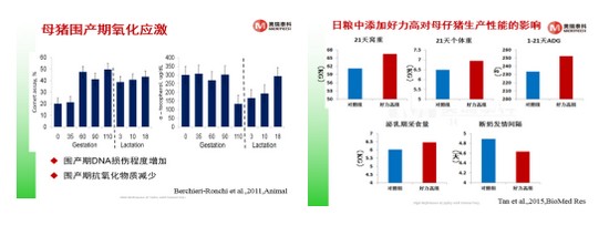 美瑞泰科研發(fā)中心王若瑾碩士報(bào)告了“母豬應(yīng)激及減輕應(yīng)激的營養(yǎng)措施”的最近研究結(jié)果。妊娠后期母豬會(huì)處于嚴(yán)重的分解代謝狀態(tài),進(jìn)而導(dǎo)致加劇氧化應(yīng)激。妊娠第110天的母豬血漿α- 生育酚濃度,會(huì)比妊娠第30 天母豬的分別降低56 %。淋巴細(xì)胞的DNA 受損可利用堿性單細(xì)胞凝膠電泳法(彗星試驗(yàn))進(jìn)行分析,顯示與妊娠第30 天顯示的母豬相比,妊娠后期的母豬內(nèi)源性DNA 損傷提高125%。在妊娠和泌乳日糧中添加具有抗氧化效果的植物提取物(好力高),可降低妊娠后期和泌乳前期的氧化應(yīng)激,提高泌乳期采食量,從而提高仔豬的生產(chǎn)性能。